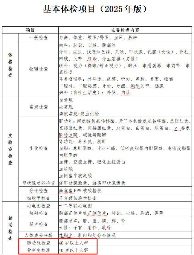 肺功能檢查、骨密度檢測為40歲及以上人群必做項(xiàng);