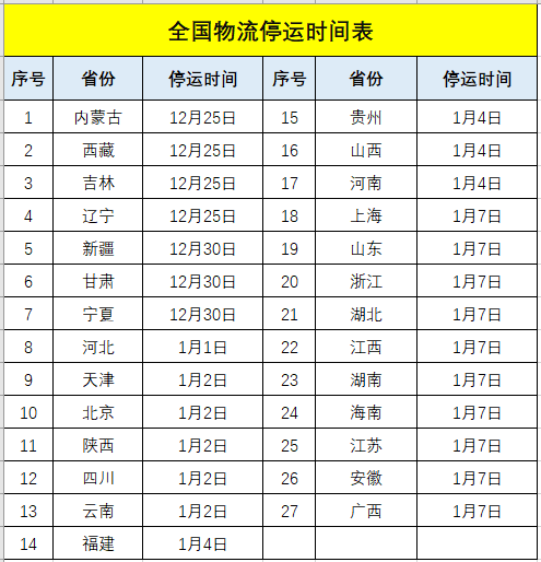 物流停運(yùn)時(shí)刻表